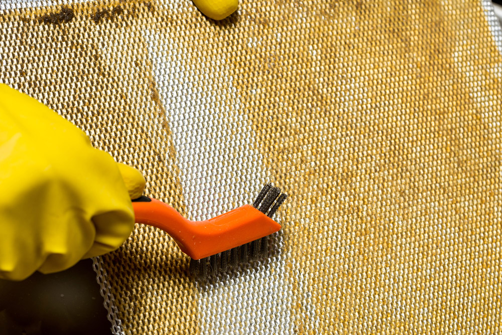 Sau khi đã ngâm xong, hãy xử dụng bàn chải nhỏ có sợi lông mềm cọ phần lưới, có thể sử dụng bàn chải đánh răng cũ. Cọ rửa sạch lần 1 xong hãy rửa tráng qua lại với nước, tiếp tục ngâm lần 2 với nước/nước rửa bát nóng và tiếp tục vệ sinh lặp lại các bước cũ. Cách này giúp bạn loại bỏ không chỉ lớp dầu mỡ bên ngoài mà còn cả bên trong, lâu ngày đều có thể sạch bay. Tuy nhiên, do để quá lâu nên sẽ không trở về được với màu trắng sáng nguyên bản, chính vì vậy hãy luôn quan tâm đến các vật dụng trong nhà và vệ sinh chúng thường xuyên hơn.