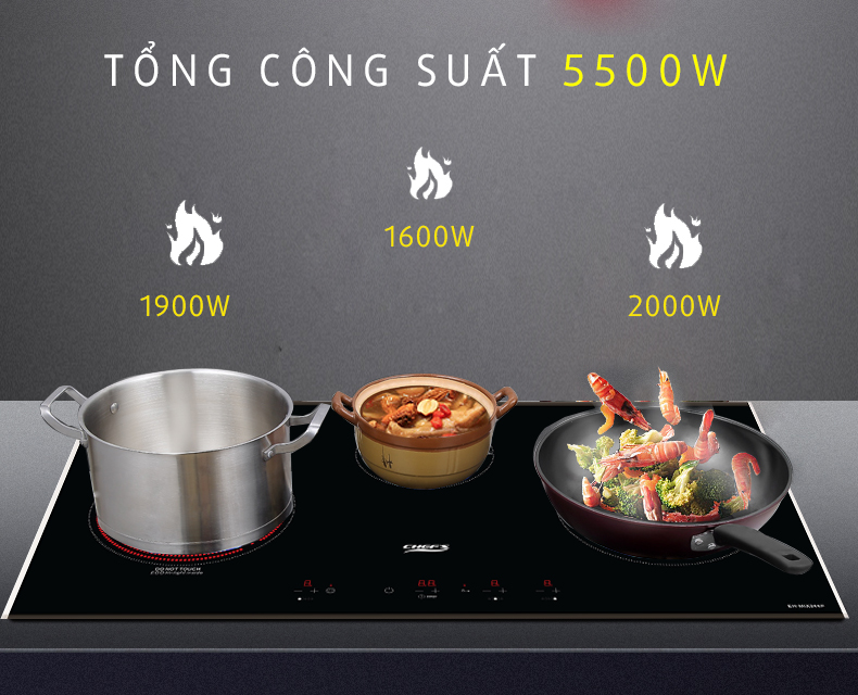 Bếp Chefs EH MIX544P thiết kế 2 vùng nấu từ và 1 vùng nấu hồng ngoại, với tổng công suất nấu là 5500W, và các mức công suất cụ thể từng vùng nấu lần lượt là: