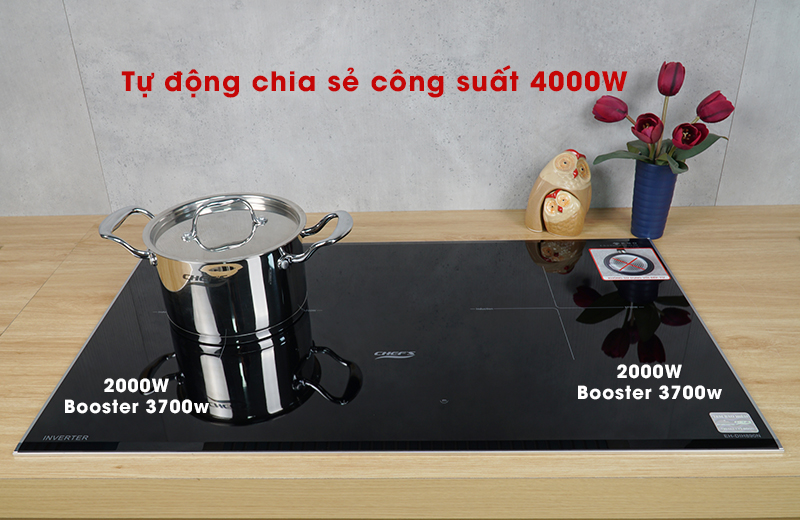 Bếp từ Chefs EH DIH890N sở hữu 2 vùng nấu riêng biệt với đều có công suất 2000W, trang bị thêm tính năng gia nhiệt nhanh Booster lên tới 3700W cho mỗi vùng. Bếp có tính năng tự động chia sẻ công suất, tối đa 4000W. Khi sử dụng đồng thời 2 vùng nấu, nếu tổng công suất đang đạt 4000W, khi một vùng nấu tăng công suất thì vùng nấu còn lại sẽ tự động giảm để đảm bảo duy trì ở mức công suất tối đa. Điều này giúp bảo vệ nguồn điện, bảo vệ bếp và tăng tuổi thọ cho bếp.
